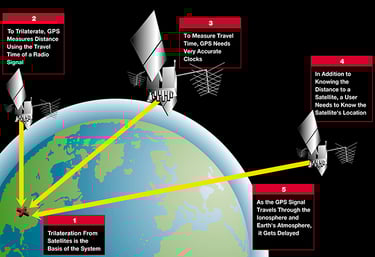 GPS modules receive signals from satellites orbiting the Earth, determining the drone's location through trilateration.