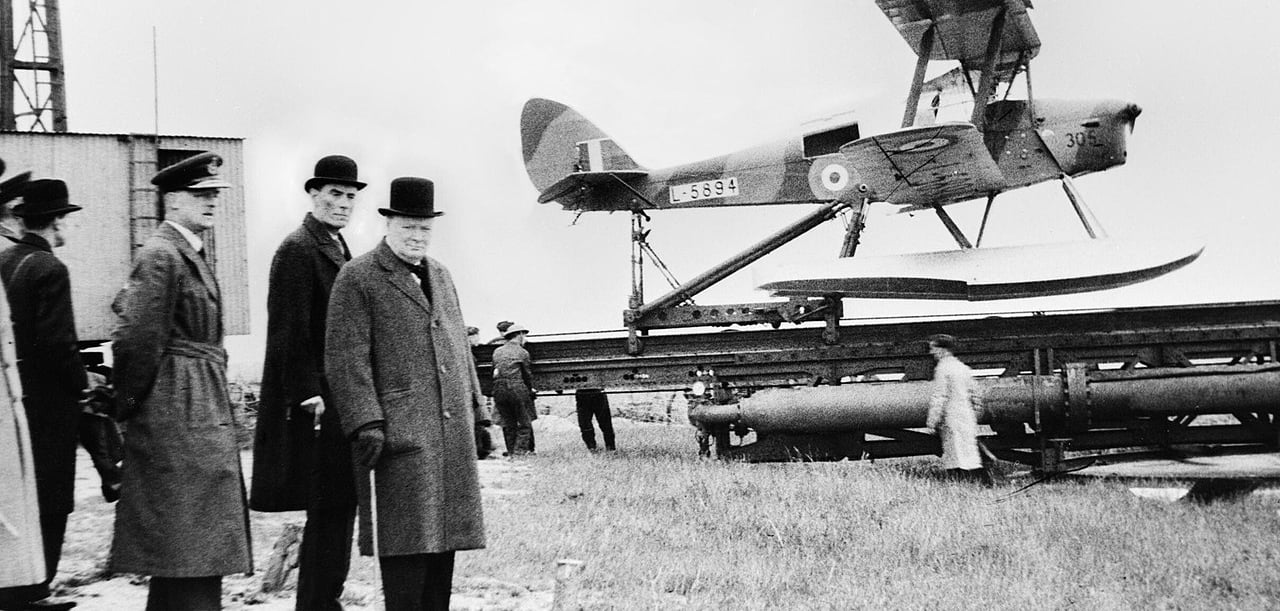Winston Churchill, David Margesson and others wait to watch the launch of a de Havilland Queen Bee target drone, 6 June 1941